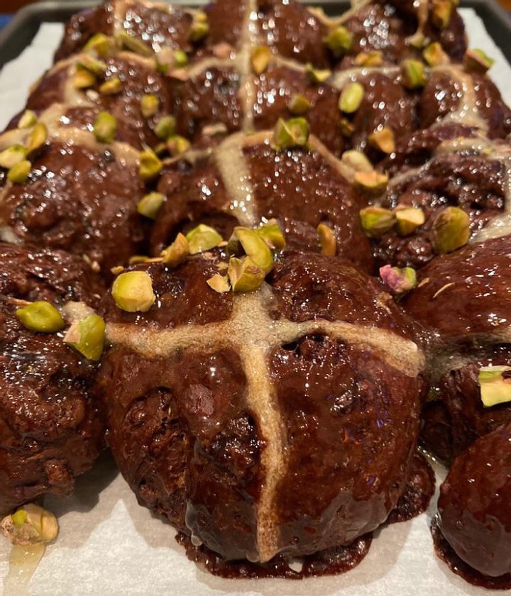 This is a luxurious version of hot cross buns for those who are not fond of the dried fruits and spices in the traditional version. These buns have a wonderful warmth from the cardamon, melting rich chocolatey insides and a refreshing orange glaze topped off with pistachio. Yum!