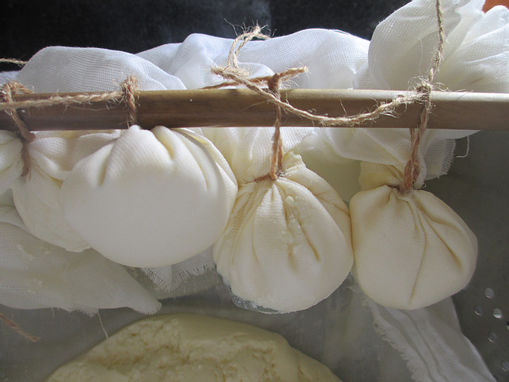 You can scoop the mixture into a container to refrigerate or drain it even further by hanging the cheese in muslin cloth bound by string and then tying it to a wooden spoon, leaving it overnight to drain and firm up in the fridge – as in the above picture.
