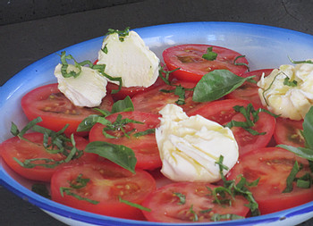 Thickly sliced tomato, basil, fresh ricotta and a generous drizzle of olive oil