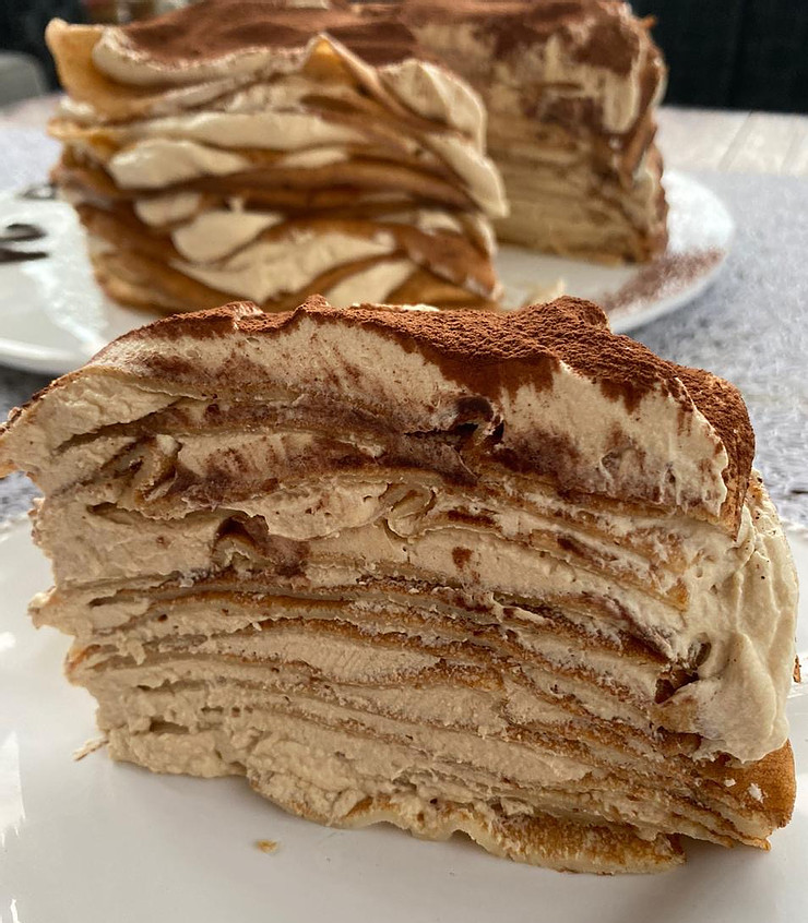 This makes a batch of about 20 pancakes which is what you will need for an average sized cake that will feed eight people that really like tiramisu and pancakes.