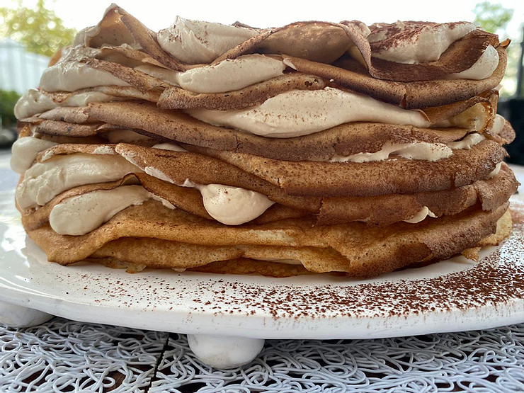 Assemble your tiramisu cake by layering a pancake and two heaped tablespoons of tiramisu mixture. Keep building the cake until either the pancakes or the cream mixture runs out. Finish it off by dusting with cocoa powder and chocolate shavings.