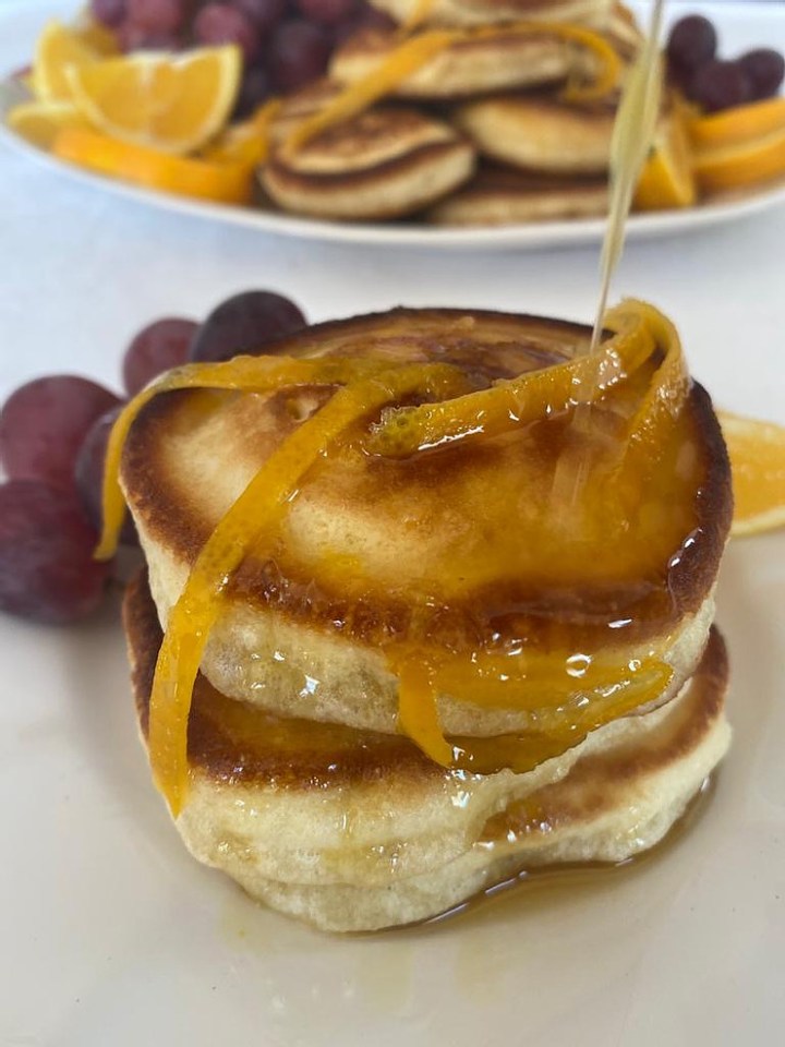 Serve the crumpets with generous amounts of the orange-honey syrup and fresh fruit of your choice.