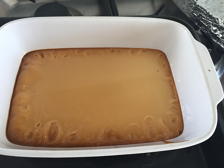 Carefully place the baking tray in the oven and bake for 90 minutes before peeking to see what colour and consistency your caramel sauce is. Keep in mind that the mixture will set when cooled and that it will be a lot firmer than what it is while hot. If you want your caramel darker, simply cover the dish and put it back into the oven.