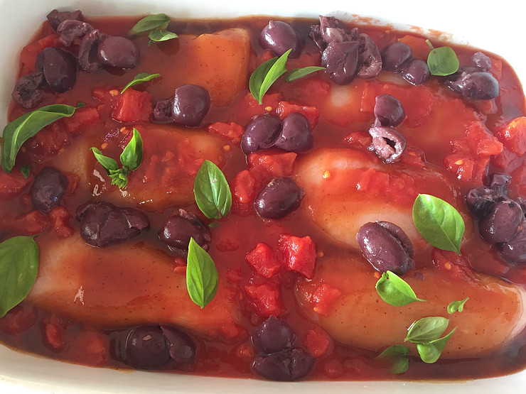 Add the Matiesous, tinned tomatoes, olives and basil leaves to a mixing bowl and stir through.
