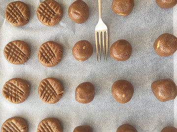 Place the balls onto the baking paper and press down lightly with the tines of a fork to make the traditional peanut butter biscuit shape.