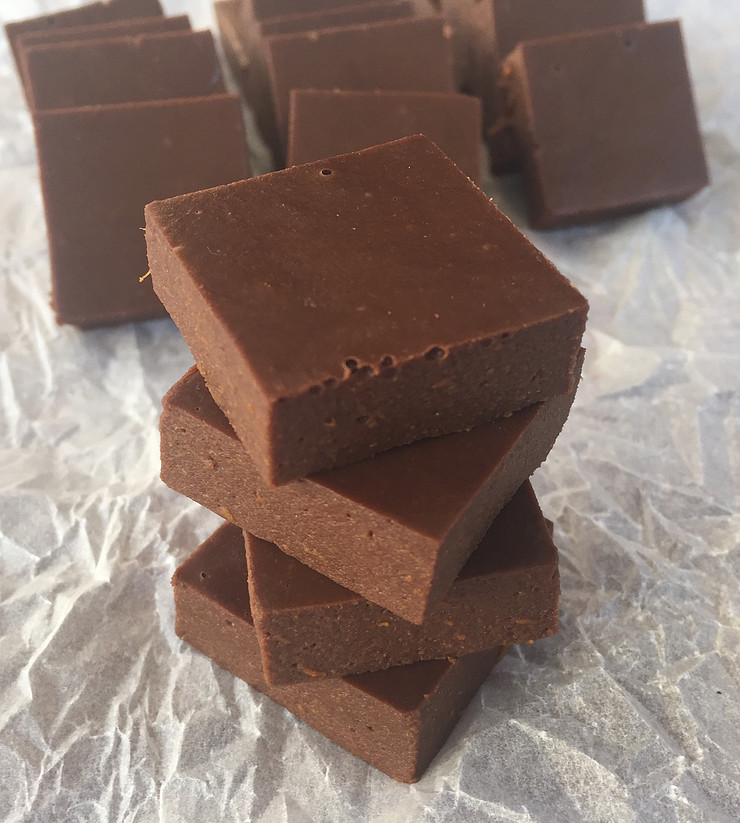 Line a small baking tin/plastic container with tinfoil and spray with cooking spray. I use a 20 x 20cm baking tin for this. The size of your container will determine how thick/chunky your fudge will be.
