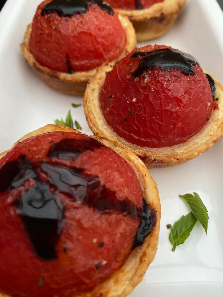 These jewel like tomato tarts are sweet, fresh and the perfect accompaniment to most summer meals. I like to drizzle mine with a balsamic vinegar reduction when I’m about to serve them but of course that is entirely up to you.