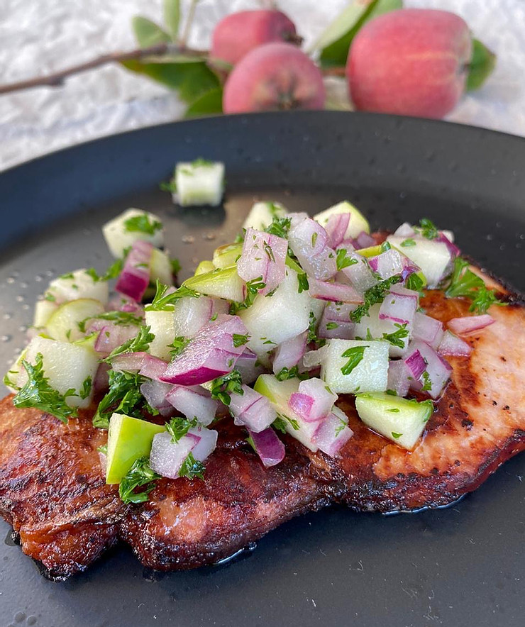 Give the salsa a good mix-through and spoon generous amounts onto the warm pork chops. Serve with buttery mashed potato and a beetroot salad.