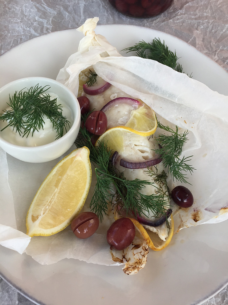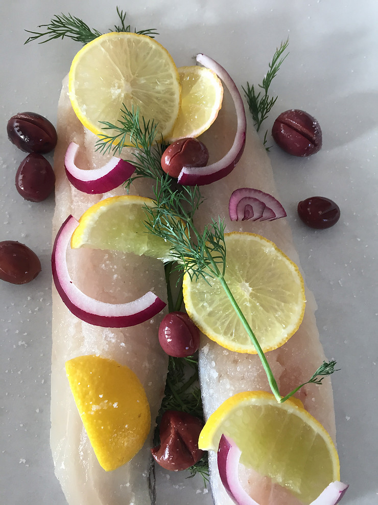 Place the fish fillet onto some dill or fresh basil leaves, season the fillet with salt and pepper and load the rest of your flavourings on top of the fillet. I like using lemon, red onion and olives but tiny rosa tomatoes, slices of orange, mushroom, bay leave also work really well.