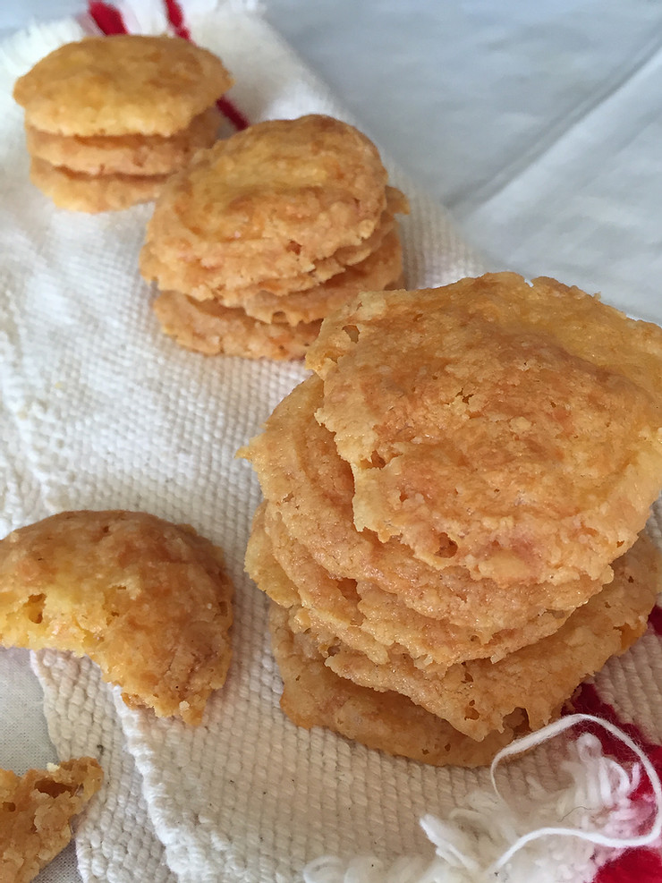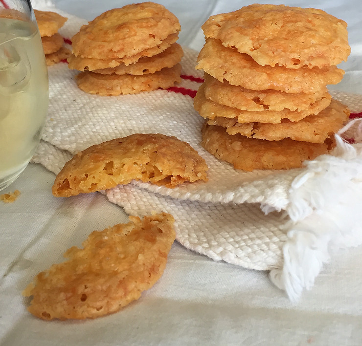 If you like savoury biscuits, you might have just found a recipe that will become a reliable fall-back to accompany pre-dinner drinks! Deliciously crispy and very, very cheesy, these biscuits can double up as a carrier for dips or spreads. The recipe makes about 40 small biscuits.