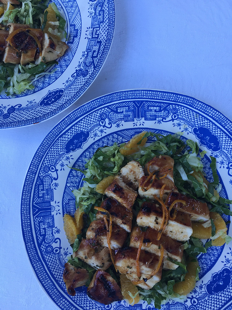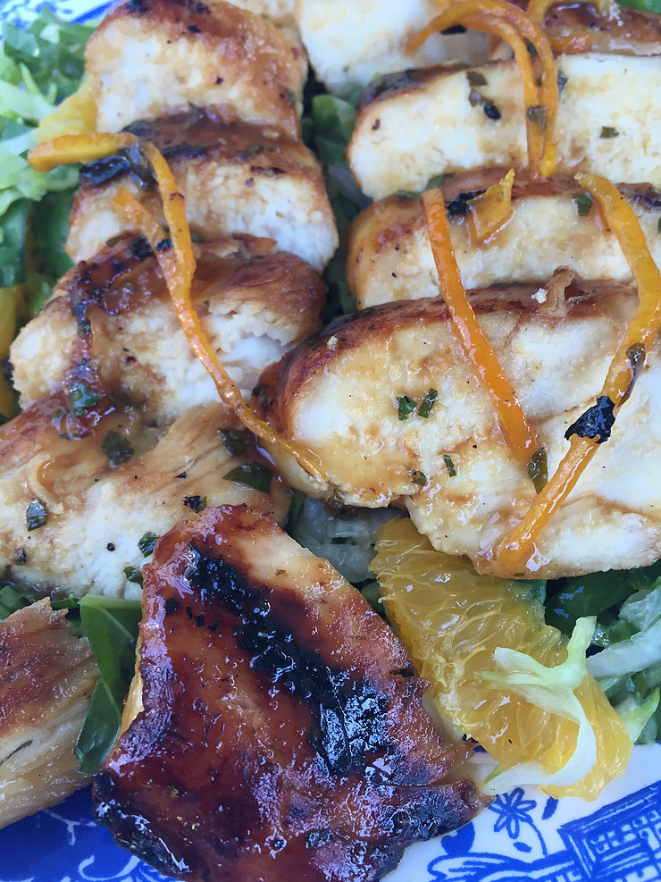 Slice each chicken breast on the diagonal and arrange on the spinach and orange.