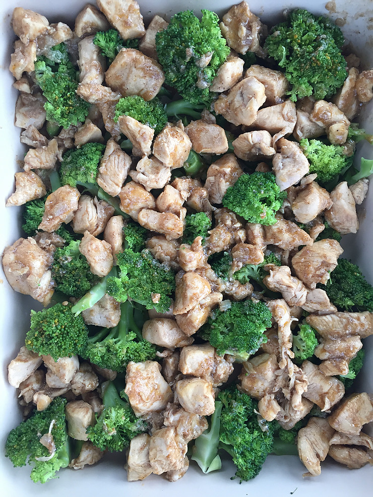 Spread the chicken over the base of the dish and arrange the broccoli in between.