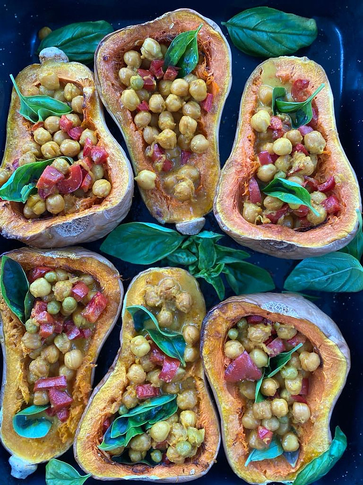 Now scoop the chickpea mixture into the butternut halves and bake for another 15 minutes.