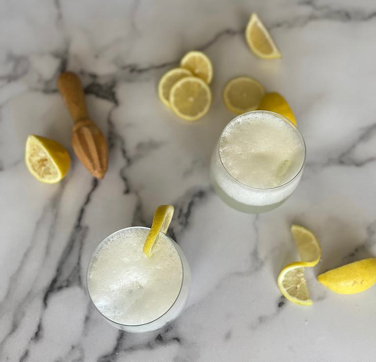 Top up with cold soda water and fresh lemon slices.