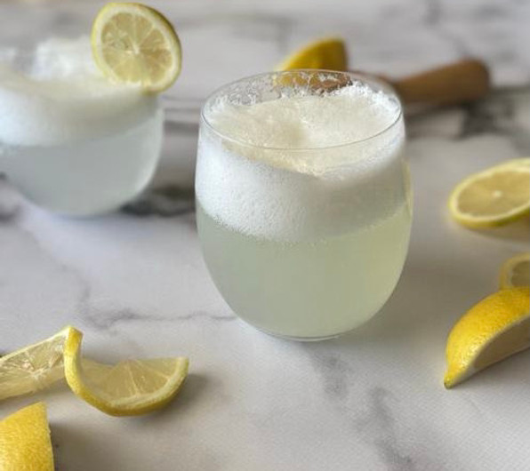 Add the sugar syrup, lemon juice, gin and egg white to a small mixing bowl.