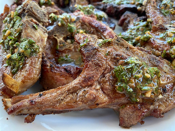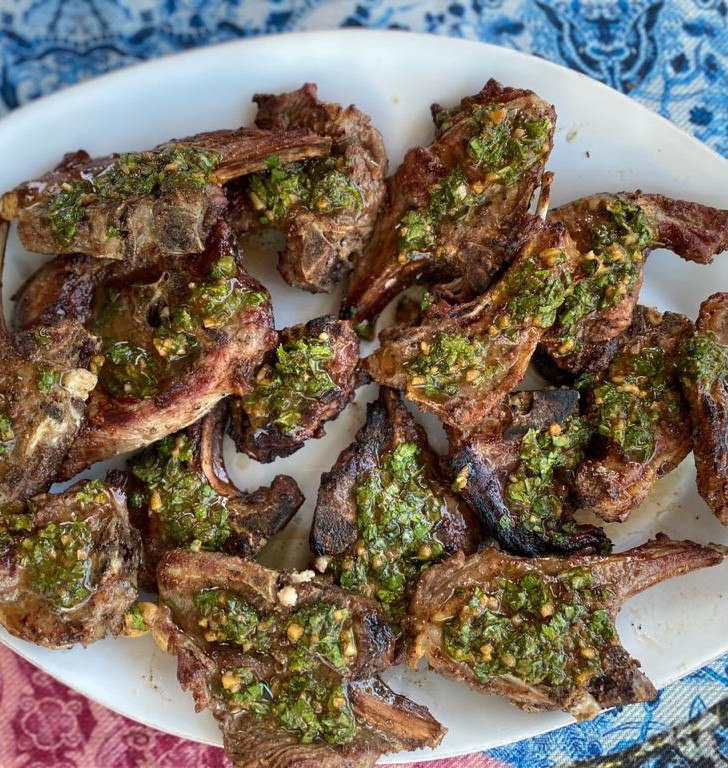 Remove the lamb chops from the fire and spoon the chimichurri sauce onto it.