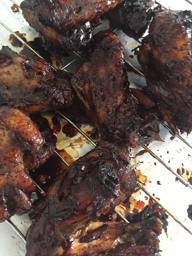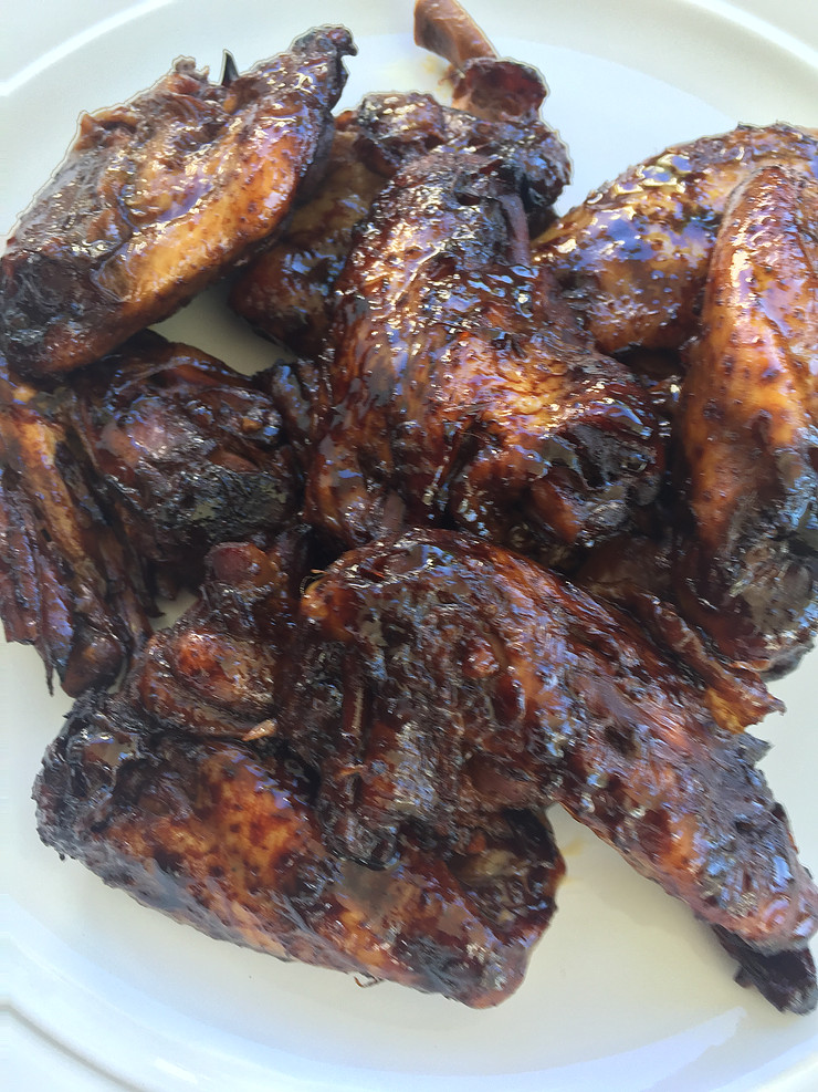 Any chicken that is dry is a disaster and especially so when it comes to wings. I pre-cook my wings, marinade them, at this stage it may or may not be frozen and then when I grill them to char, I baste them with the marinade. This recipe guarantees you delicious, moist wings that stick to your fingers.