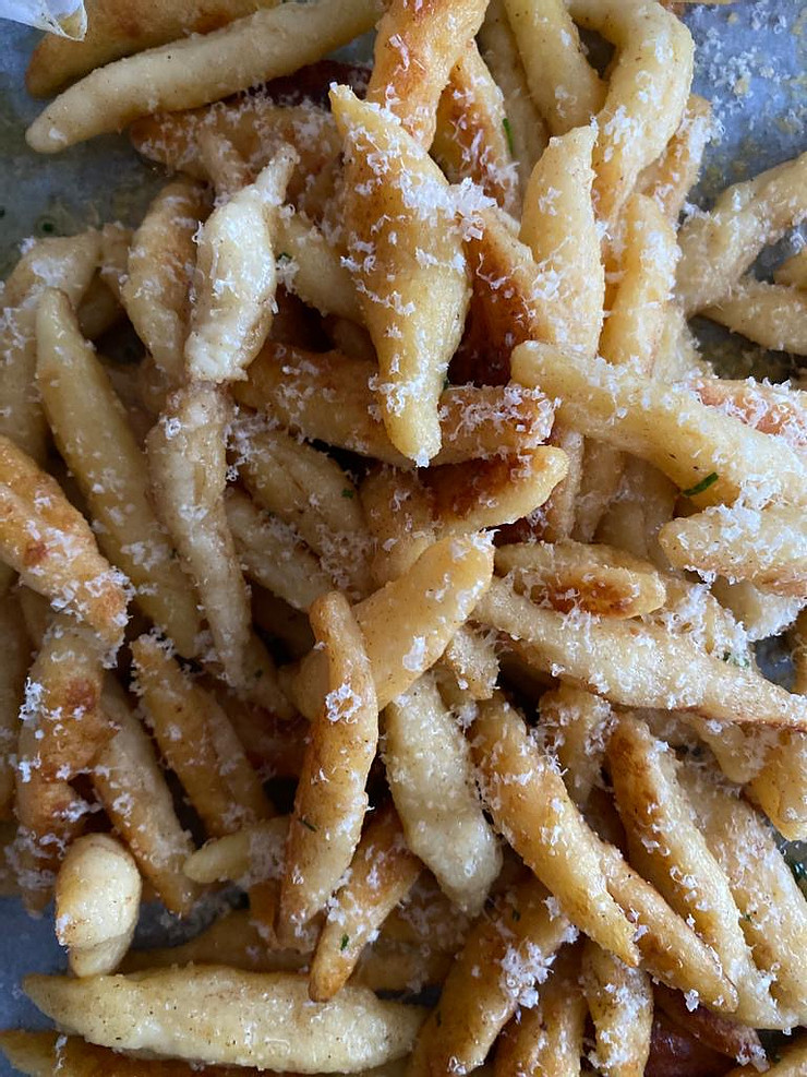Schupfnudeln is similar to Italian gnocchi but more sturdy and easier to panfry. It is delicious both savoury and sweet. To make a sweet variation, follow the recipe until the nudeln is fried in butter and then simply add custard, raspberry sauce or roll the nudeln in poppy seeds before pan frying.