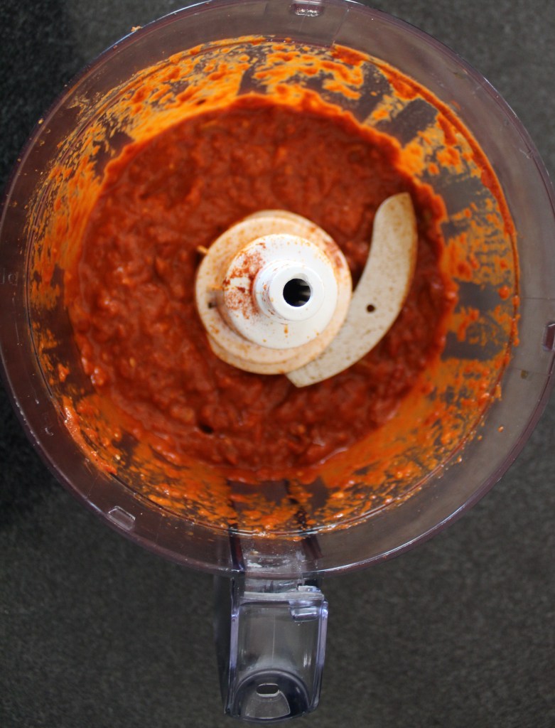 Roast/char the red peppers, remove the skin and seeds and add the flesh to the bowl of a food processor.