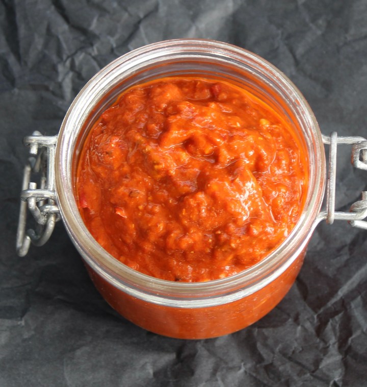 Spoon the harissa paste into a glass container and pour a small amount of vegetable oil on top.