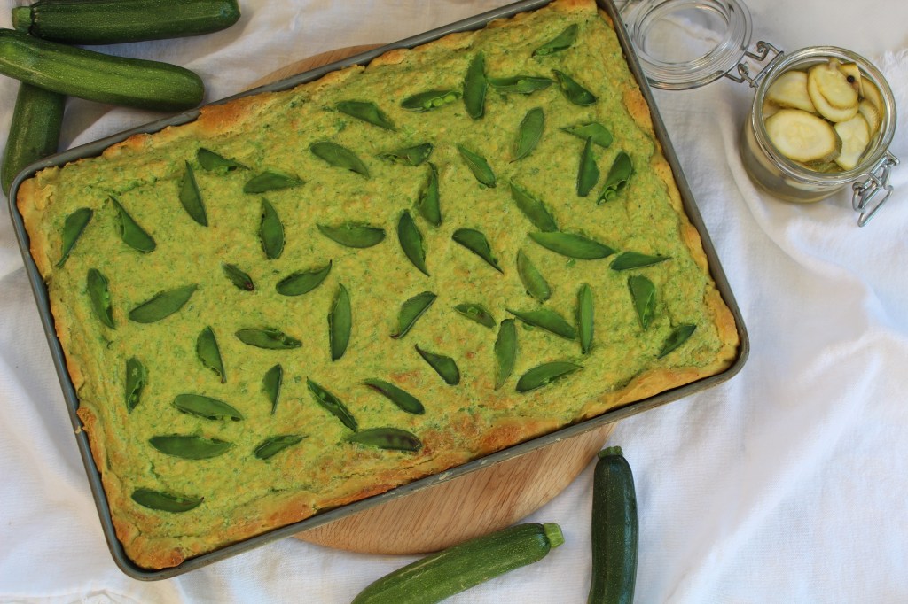 Pour this mixture onto the avocado-pastry and scatter the fresh sugarsnaps on top.