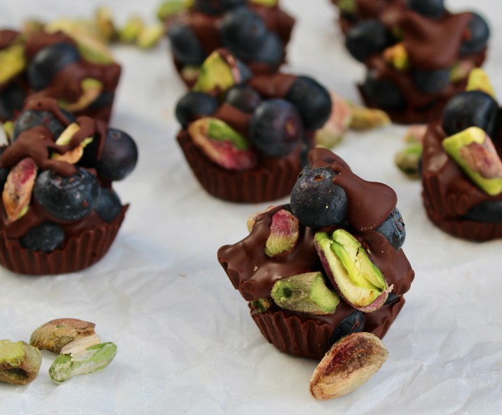 Add about three blueberries and two pistachio nuts to the cups and then drizzle with another half teaspoonful of melted chocolate.