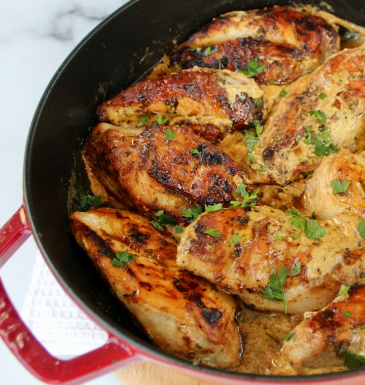 This is one of those easy mid-week meals that takes no time at all to prepare and leaves one surprised at the amount of punchy flavour and goodness on a plate! The sauce is enough for 6 – 8 chicken breasts but equally for 4.