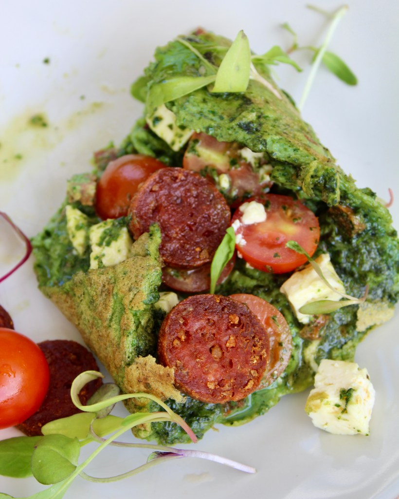 Scatter the chorizo, tomato and feta in a line down the centre of the omelette and cook for one minute longer.