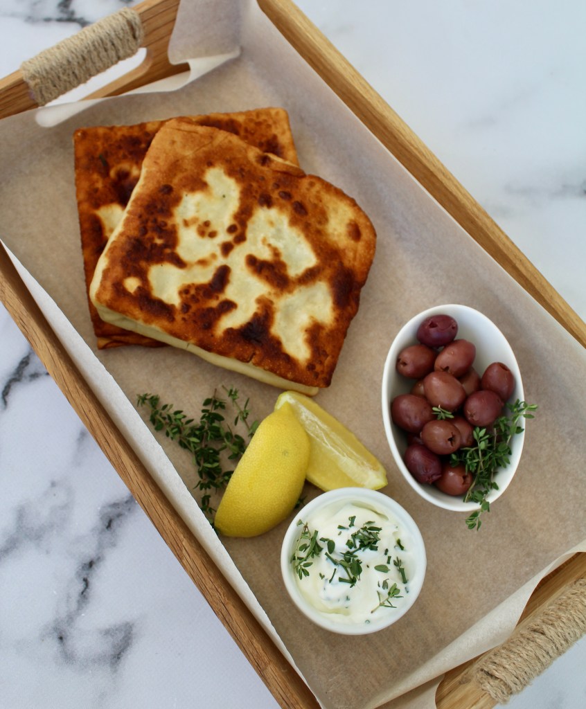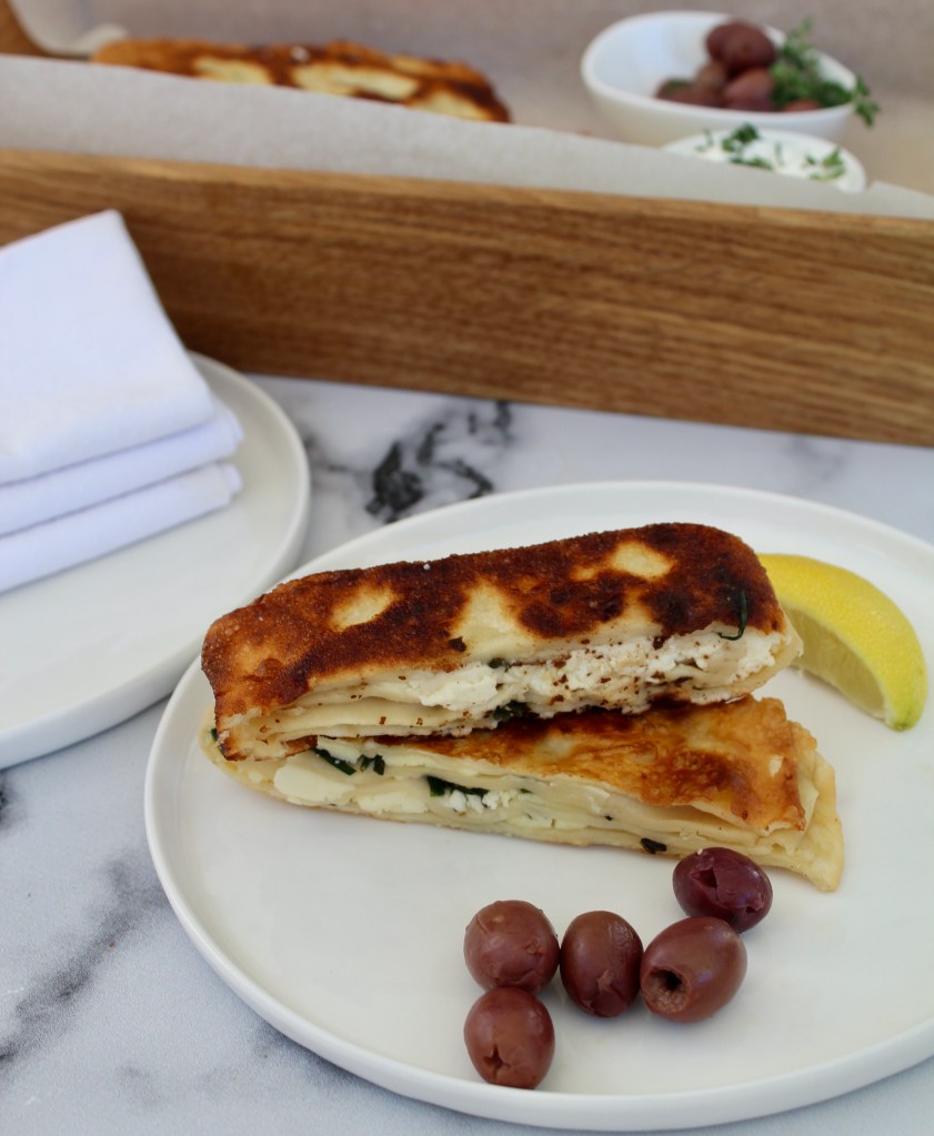This is such an easy filled bread to make and is guaranteed to transport you straight back to that Greek Taverna on the beach and all its wonderful aromas and tastes!! It is crispy, subtly flavoured and makes a great addition to mezze. Yields four flatbreads.