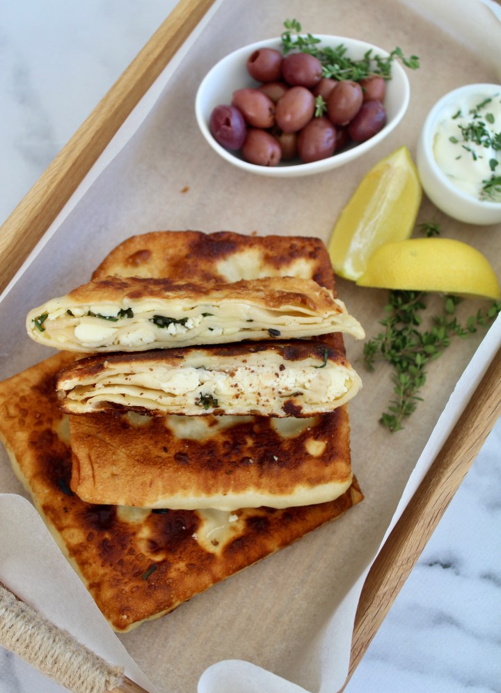 This is such an easy filled bread to make and is guaranteed to transport you straight back to that Greek Taverna on the beach and all its wonderful aromas and tastes!! It is crispy, subtly flavoured and makes a great addition to mezze. Yields four flatbreads.
