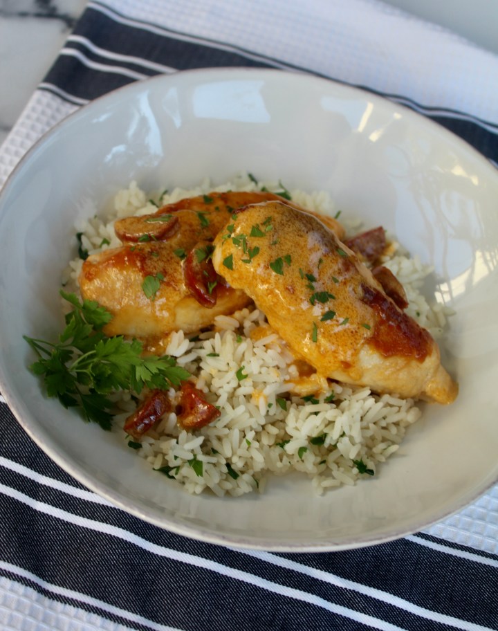 Add the butter to the warm pan and brown the chicken breasts on both sides – about 3 minutes per side.