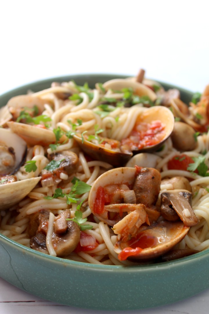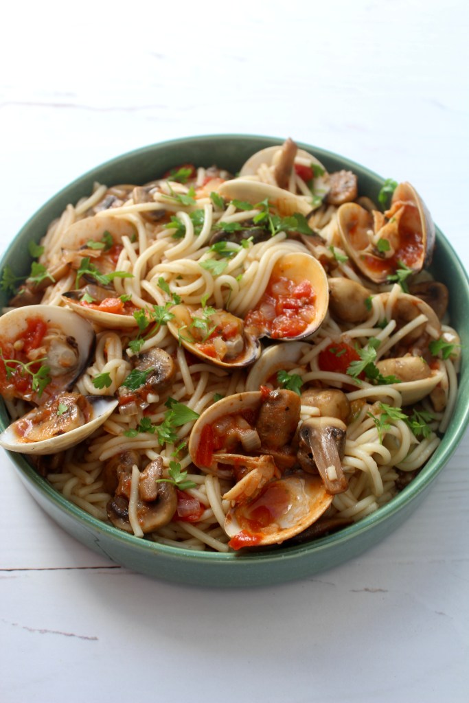 Now add the tomatoes as well as the clams and simmer gently for 5 minutes.