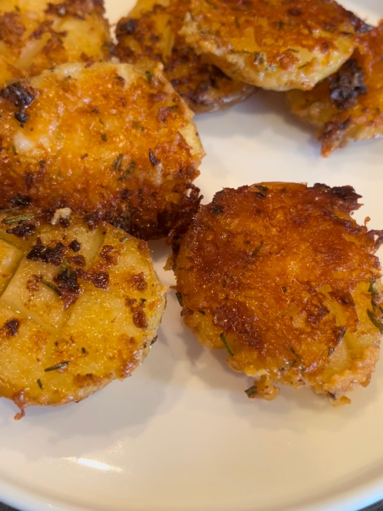 Brush the cut side of each halved potato with the mixture and then dip it into the parmesan.