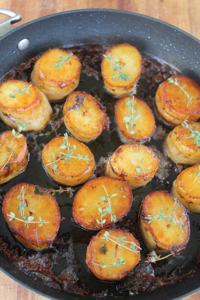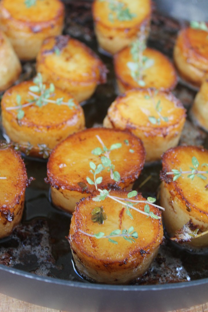 Arrange the potatoes, flat side down in the pan and cook until golden – about 6 minutes.