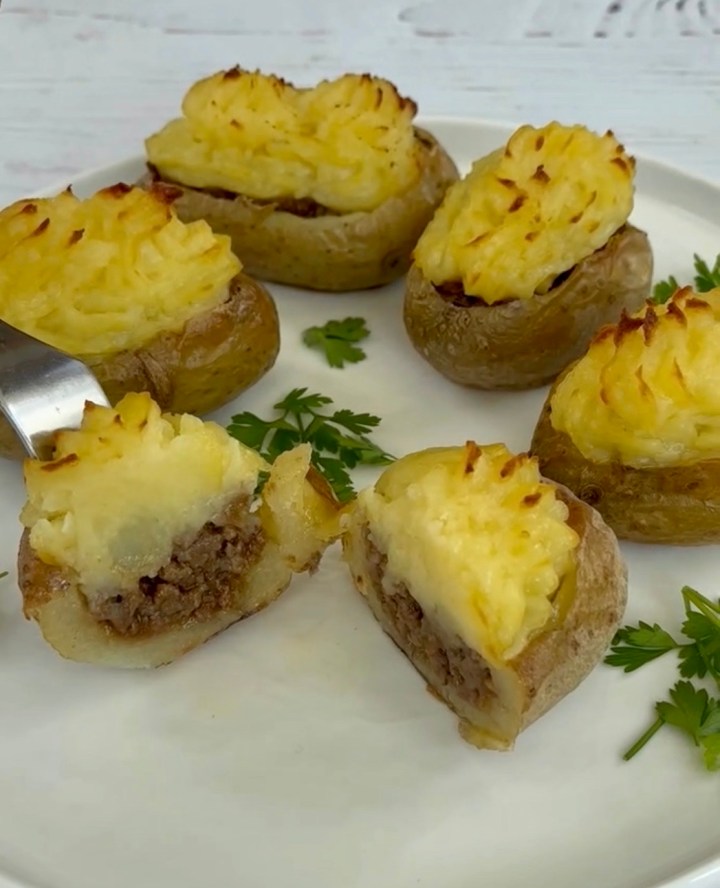 Spoon some of the beef into the hollowed potato and pipe some mashed potato over the beef.