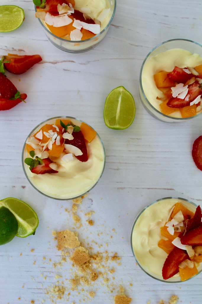 Add the coconut, mix through and divide amongst 12 serving glasses. Set aside.