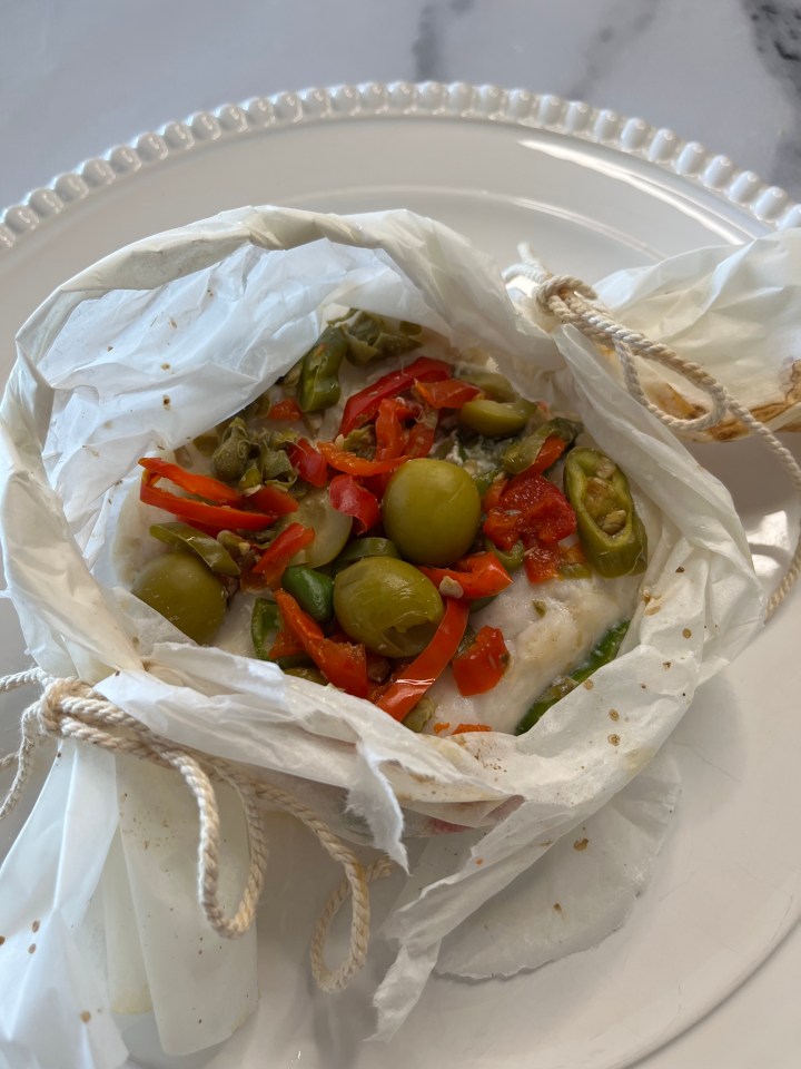 Add the sweet peppers, olives, capers and peppadews to a small bowl and mix through. Divide the mixture equally and spoon onto the fish.