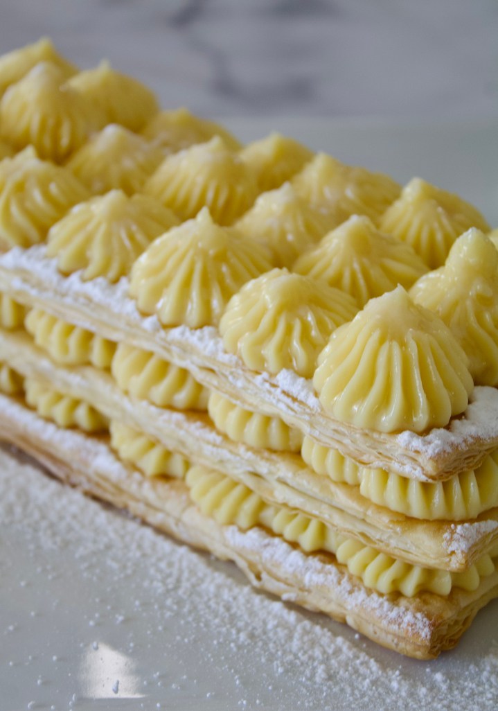 Place the iced pastry on top of the custard slice.
