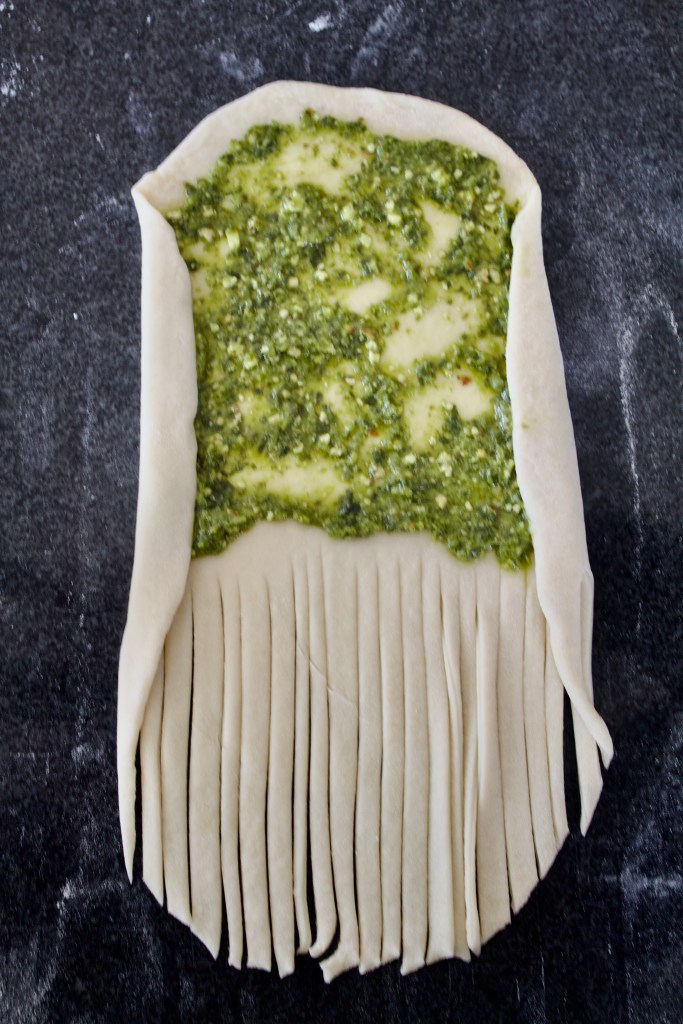 Fold a 1cm edge on the sides, over the pesto and roll that section into a log. Roll over the part that are cut into strips.