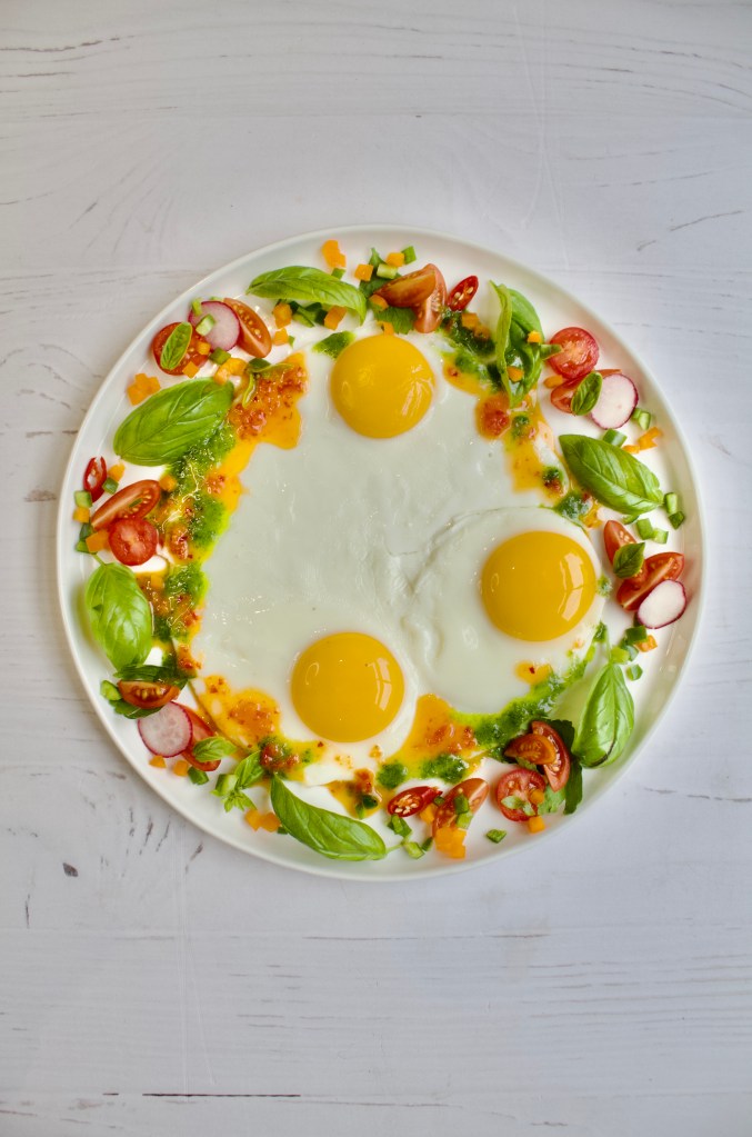 This is my take on the spicy Turkish Eggs – spicy but with a zippy herby sauce to balance the heat. The ingredients/sauces are enough to feed one person.