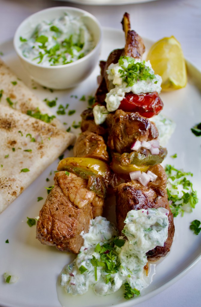 Grill the kebabs on an open fire – 3 minutes per side x 4, until beautifully charred.