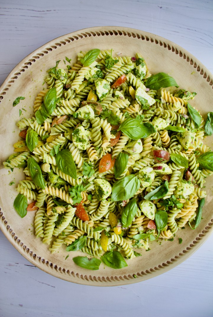 Add the cooled pasta, tomatoes, parsley, basil, bocconcini and red onion to a large bowl and toss through.