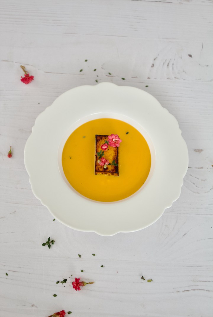 Decorate the top surface of the butternut with small flowers and herbs to serve.