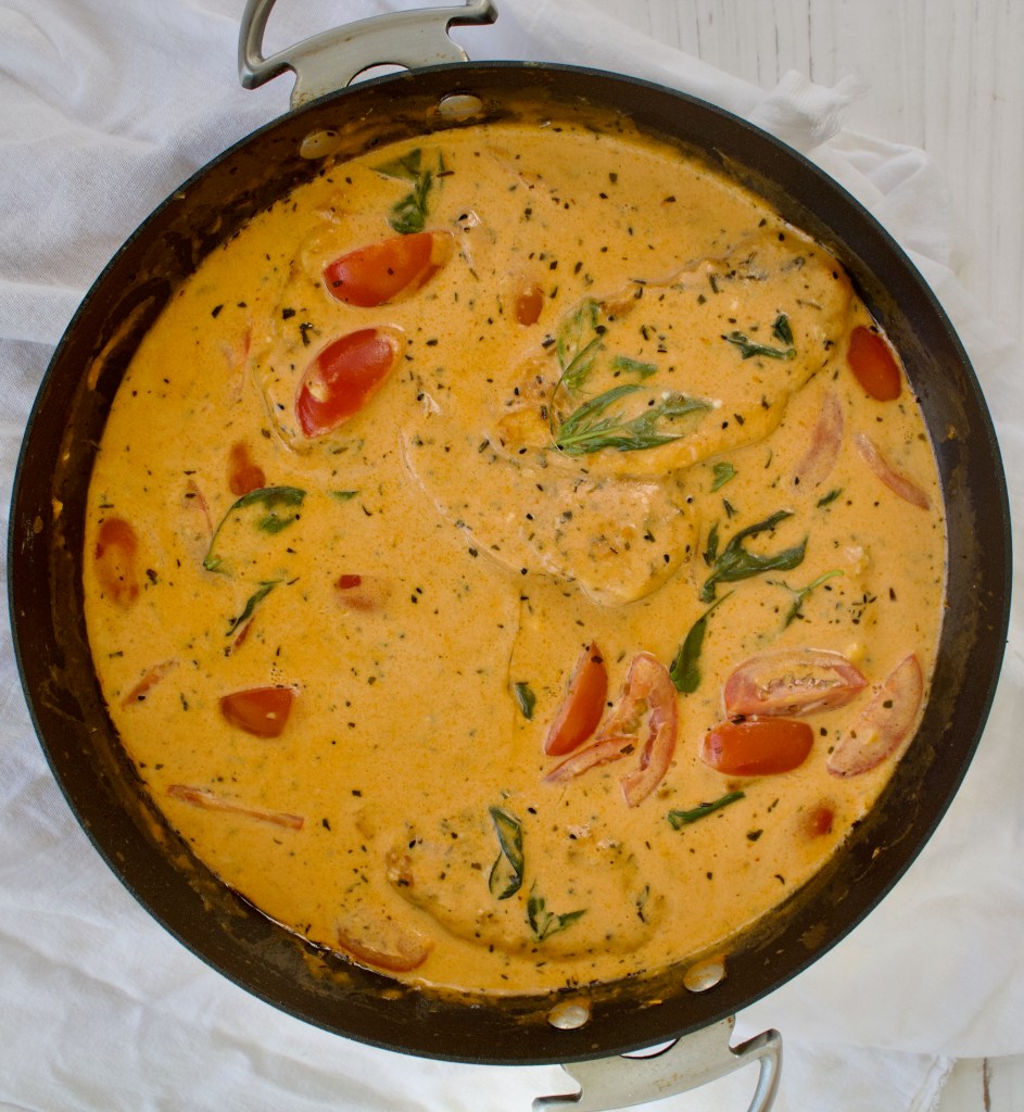 Add the olive oil to a pan set over medium-high heat and sear a few pieces of chicken at a time. (about 4 minutes). Set aside.