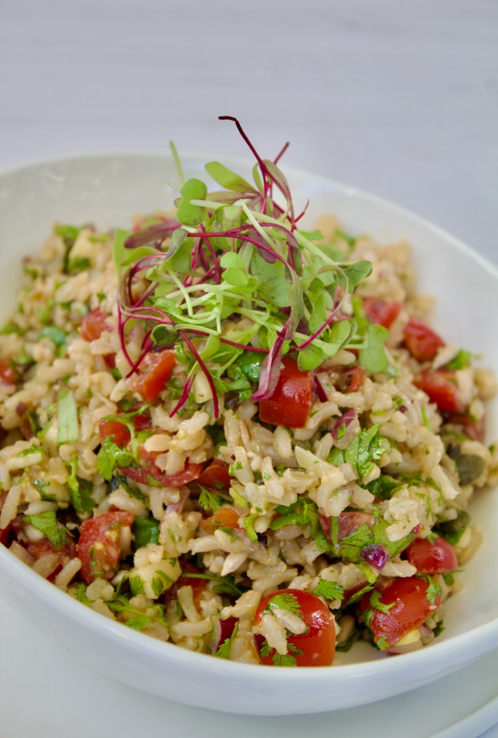 Drizzle over the brown rice salad and give everything a very good mix.