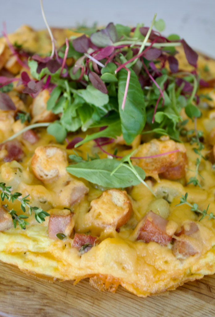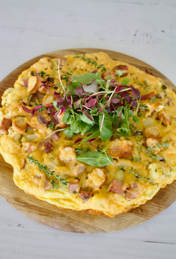 Sprinkle the croutons and cheese over and bake in the oven until cooked.