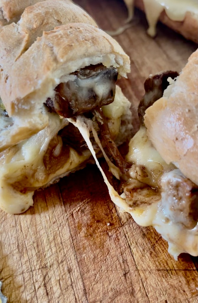 Place the top halves of the baguette on top of the melted cheese and bake for another 3 minutes or so to warm it through.