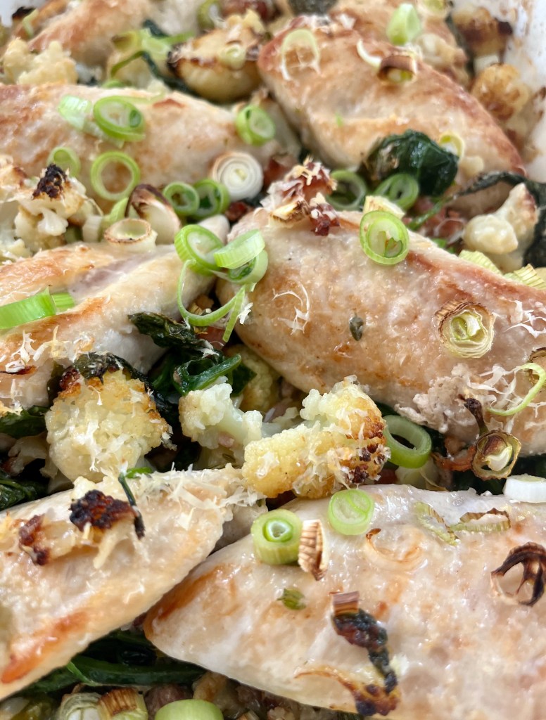 Arrange the chicken on top of the cauliflower mixture and then push it down slightly.