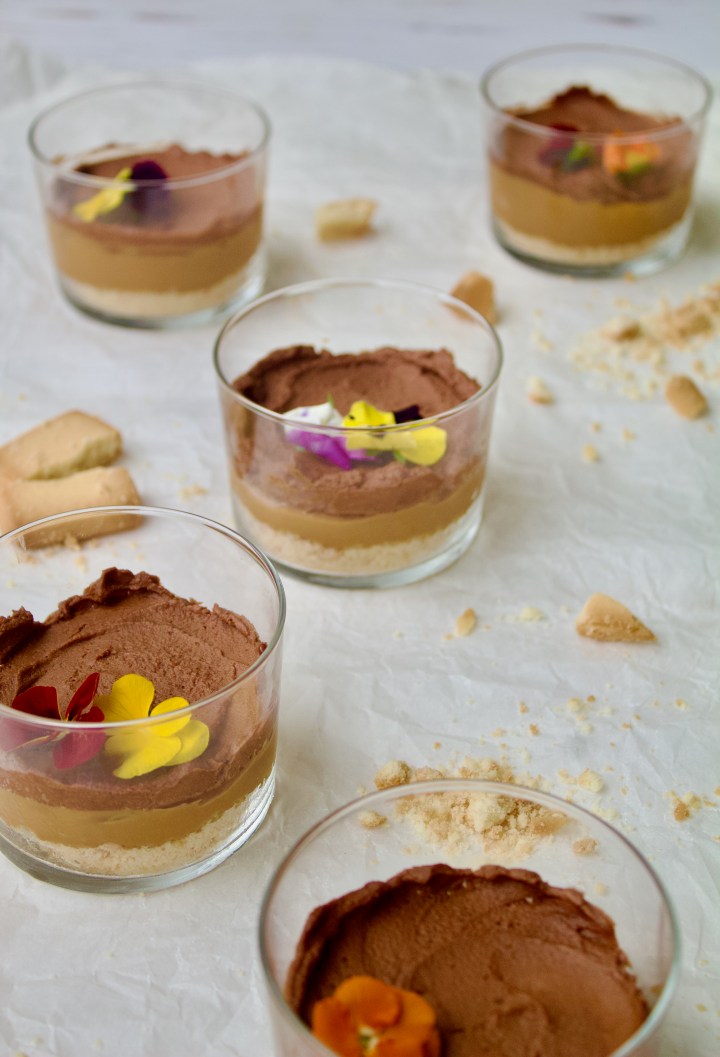 Scoop a large heaped dessert spoon of crumbs into 6 ramekins/glasses and give it a shake to level out. Set aside.
