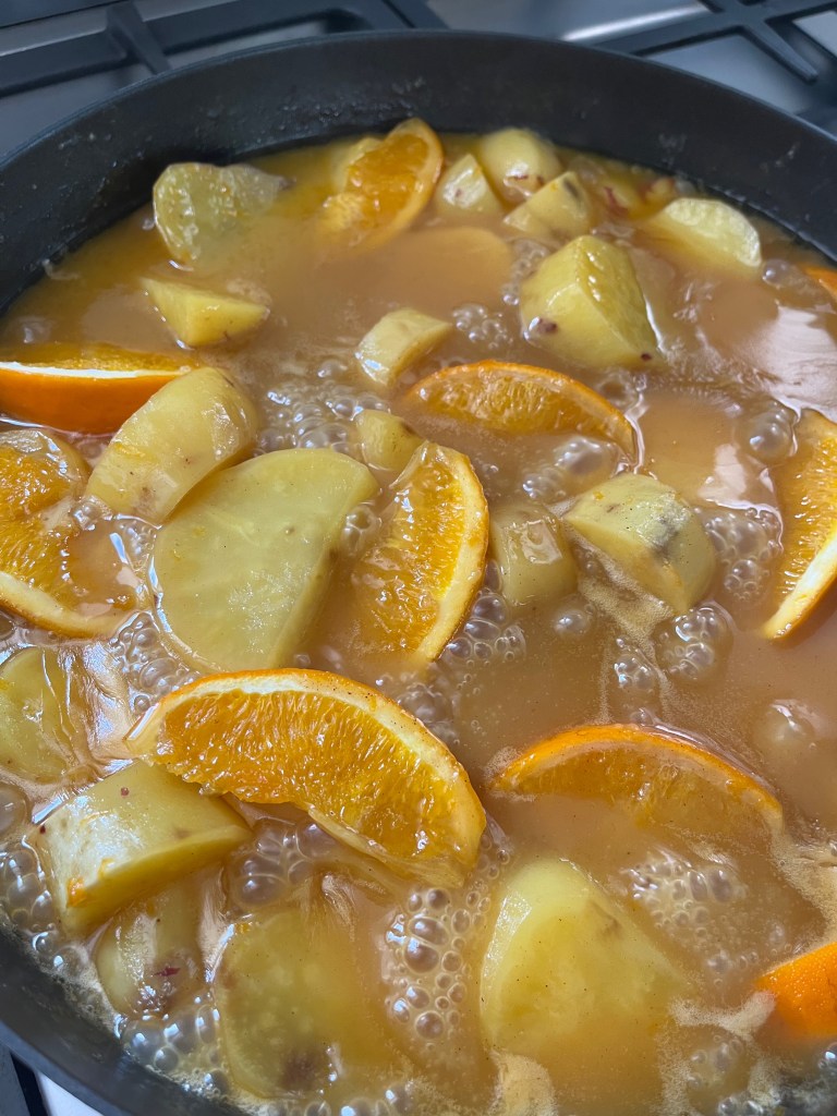 Now add the sweet potato chunks, cover with a lid, turn the heat down to medium and cook without stirring for about 40 minutes.